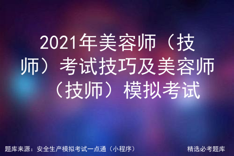 2021年美容师(技师)考试技巧及美容师(技师)模拟考试,包含美容师(技师)考试技巧答案和解析及美容师(技师)模拟考试练习。由安全生产模拟考试一点通公众号结合国家美容师(技师)考试最新大纲及美容师(技师)考试真题汇总,有助于美容师(技师)复审模拟考试考前练习。