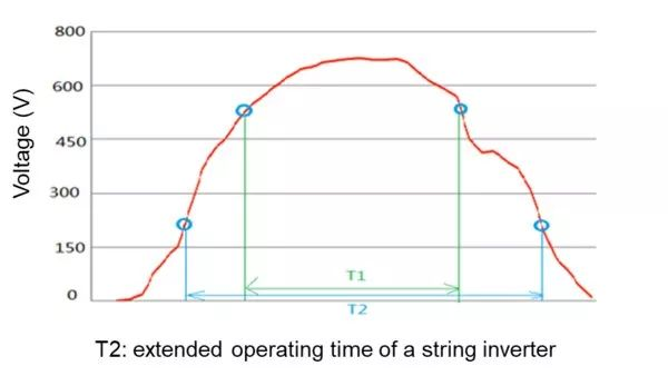 组串MPPT工作电压范围宽,让逆变器“早起晚睡”,延长发电时间,进一步提升电站效率。华为智能组串式逆变器采用双极拓扑结构,组件输出电压经过BOOST直流升压电路,当直流输入电压低时,可以升压满足母线电容的要求,所以智能组串逆变器MPPT工作电压范围200V~1000V;而集中式逆变器采用单机拓扑结构,MPPT工作电压范围一般在520V~1000V,这样组串逆变器可以工作更久,发更多的电。