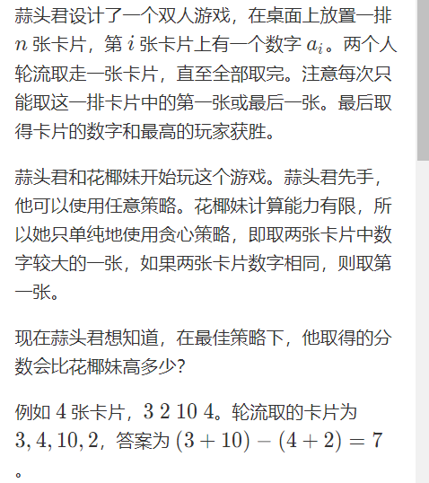 设dp[l][r] 为区间内l到r时蒜头君减去花耶妹的答案