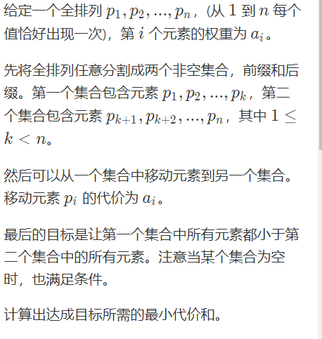 {scanf("%d",&n);for(int i=1;i<=n;++i){scanf("%d",&p[i]);}for(int i=1;i<=n;++i){scanf("%d",&a[i]);}for(int i=1;i1;--i){if(p[i]+1<=n) up(1,1,n,p[i]+1,n,a[i]);up(1,1,n,1,p[i],-a[i]);ans=min(ans,mi[1]);}printf("%lld\n",ans);