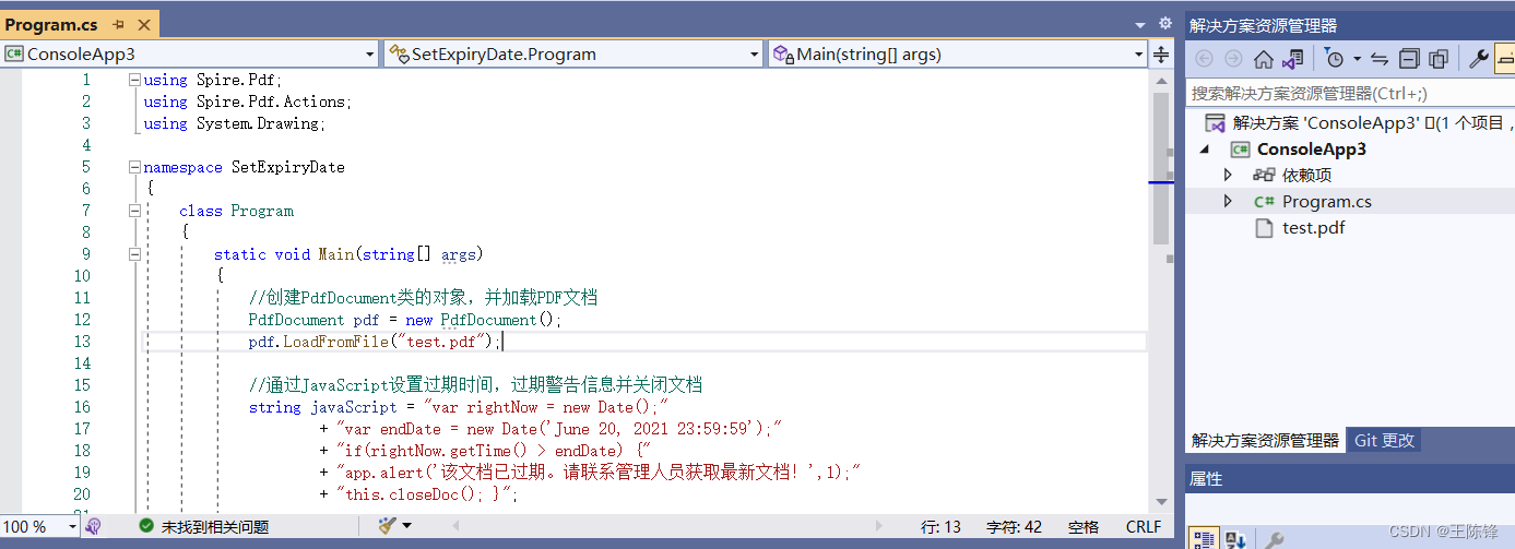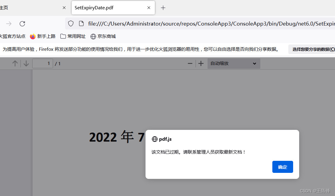 {class Program{static void Main(string[] args){//创建PdfDocument类的对象,并加载PDF文档PdfDocument pdf = new PdfDocument();pdf.LoadFromFile("test.pdf");//通过JavaScript设置过期时间,过期警告信息并关闭文档string javaScript = "var rightNow = new Date();"+ "var endDate = new Date('June 20, 2021 23:59:59');"+ "if(rightNow.getTime() > endDate) {"+ "app.alert('该文档已过期。请联系管理人员获取最新文档!',1);"+ "this.closeDoc(); }";//根据JS创建PdfJavaScriptAction PdfJavaScriptAction js = new PdfJavaScriptAction(javaScript);//将PdfJavaScriptAction设置为文档打开后的动作pdf.AfterOpenAction = js;//保存文档pdf.SaveToFile("SetExpiryDate.pdf", FileFormat.PDF);}}