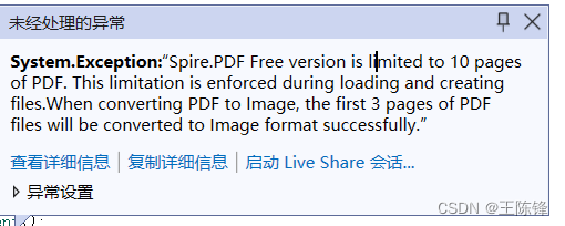 然后去调试,发现是FreeSpire.PDF的问题,它限制了PDF页数不能超过10页。