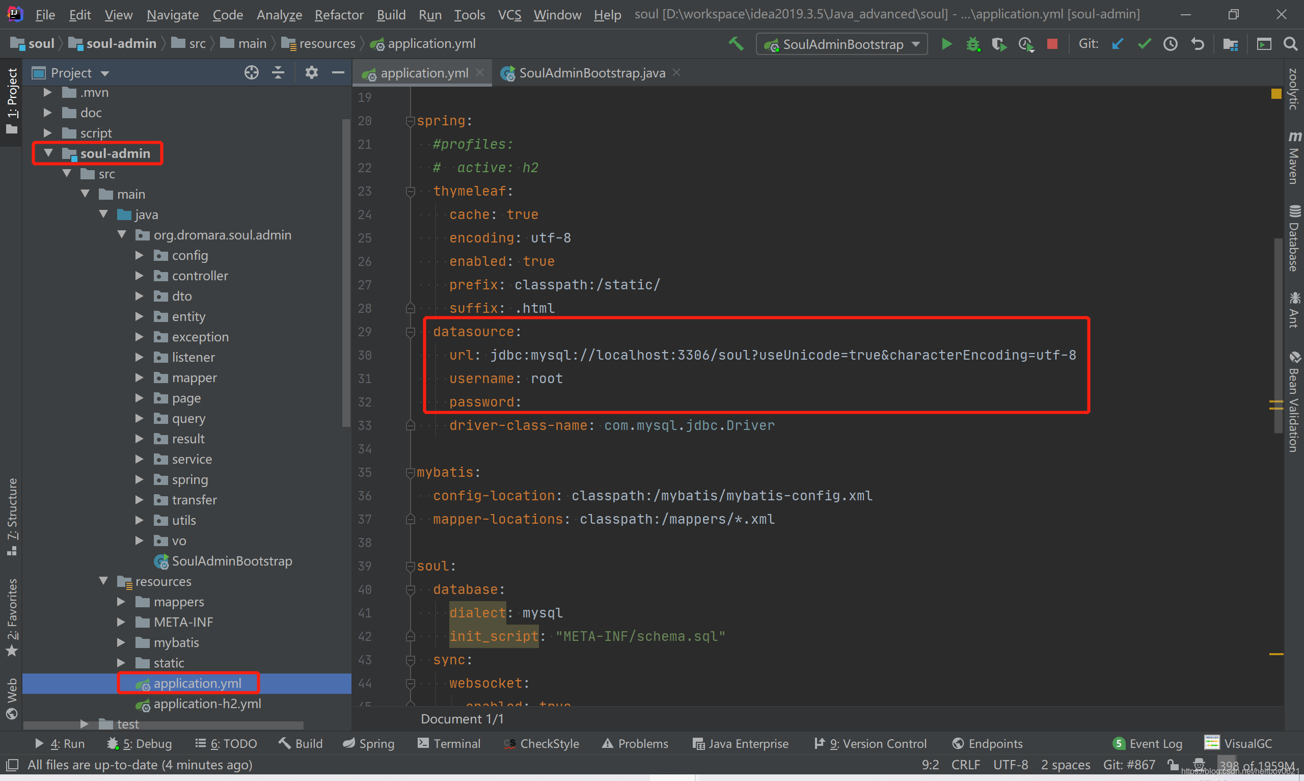 在 IDEA 里找到 soul-admin 模块,按照各自数据库配置,修改配置文件(我的是3306端口号,用户名root,没有密码)
