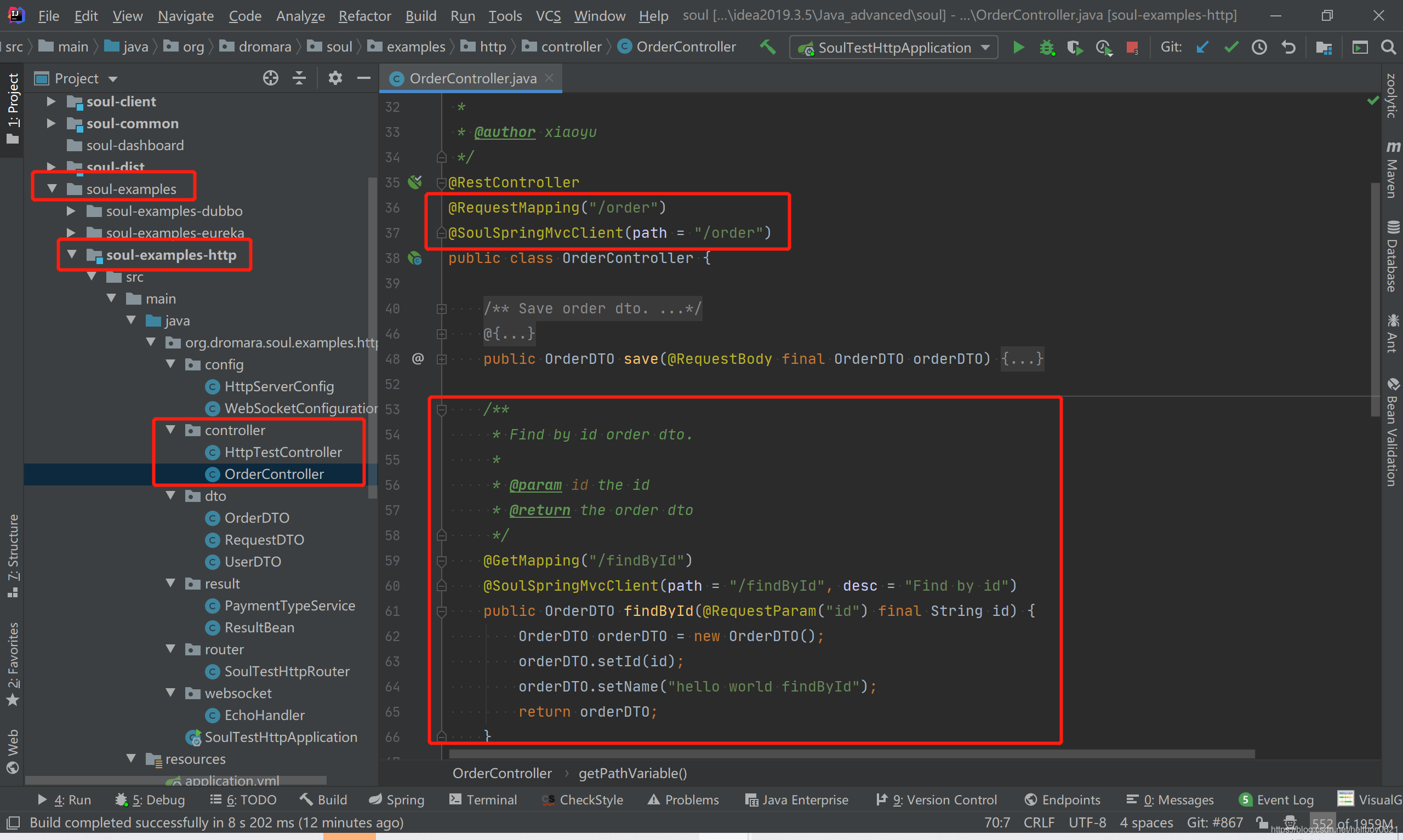 在 soul-examples-http 项目下的 controller 层,可以看到这些接口信息,如下图这个接口 /order/findById。