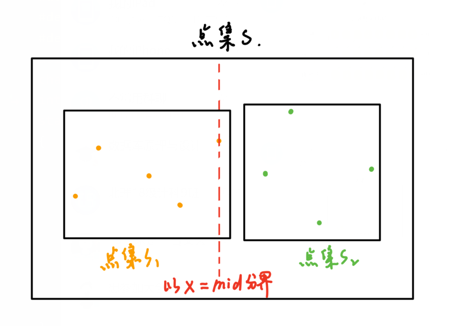 对于最初输入的 n 个点构成的点集S,大致均分成两部分:以所有点的x坐标的中位数mid为界,分为点集S1:x坐标比mid小的点 和 点集S2:x坐标比mid大的点。如下图所示: