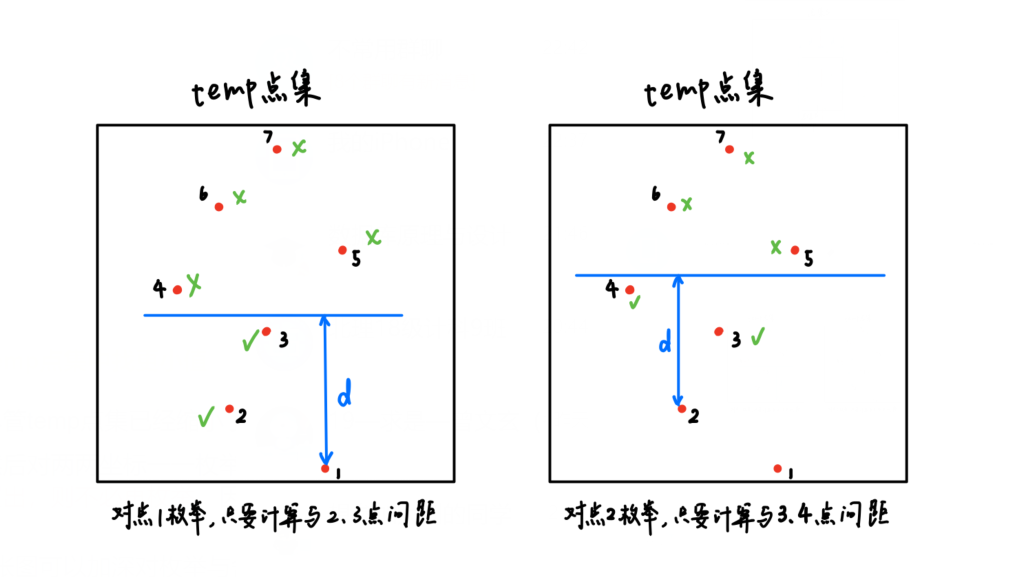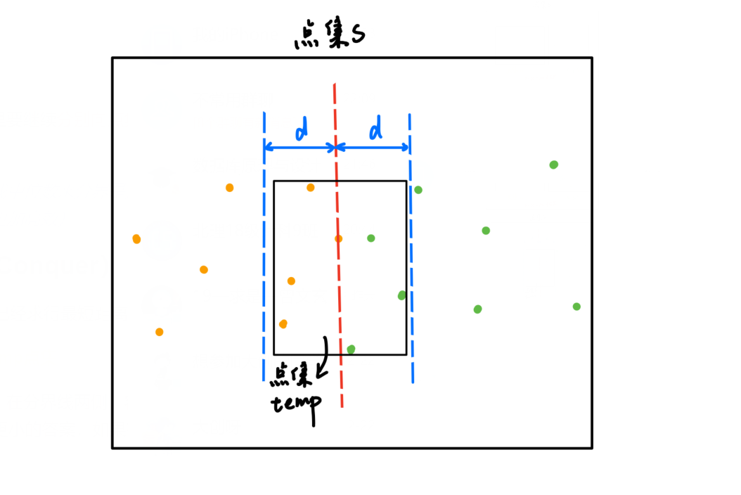 需要注意到,在分界线两侧,容易出现比 d 更小的答案。经过论证(略,具体查阅算法书),我们需要在距离分界线 d 之内枚举各点,是否出现比 d 更小的答案,如果有,则要更新d。于是我们将在距离分界线 d 之内的各点储存在temp点集中,方便接下来的讨论。