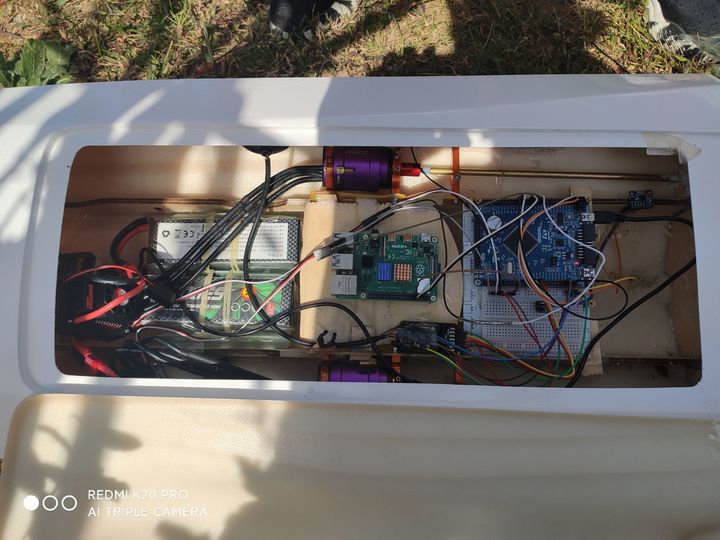 应该把树莓派设置为每次开机自动连接到你的一个WIFI Hotspot上,同时开启树莓派的ssh或vnc,便于远程无线调试。总不想船上面还要插一个显示器吧?