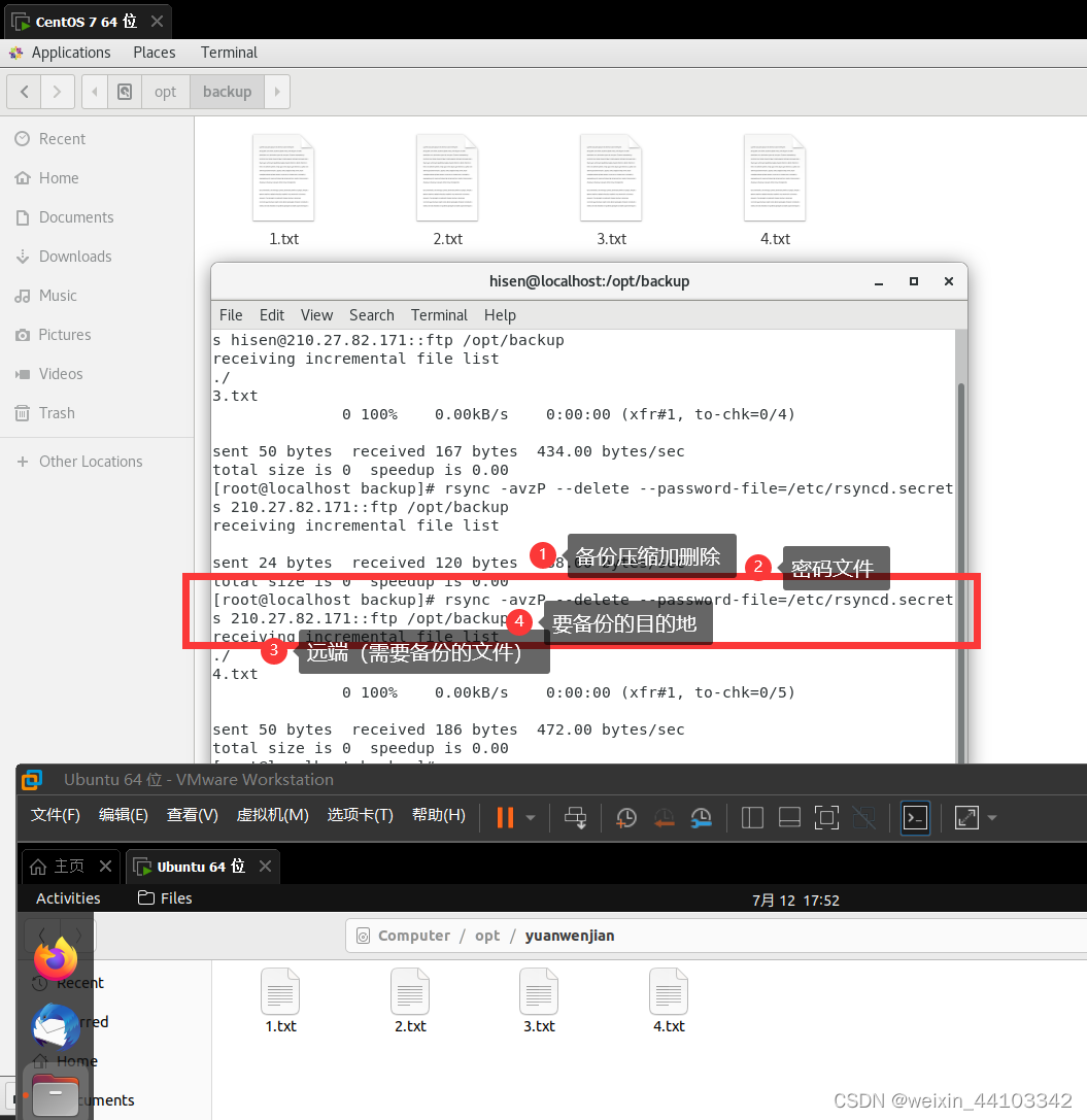 将客户端文件推送至远端 rsync -avzp --password-file=/etc/rsyncd.secrets /opt/backup/ 210.27.82.171::ftp 与拉取区别在客户端文件夹位置在前 远端ip在后