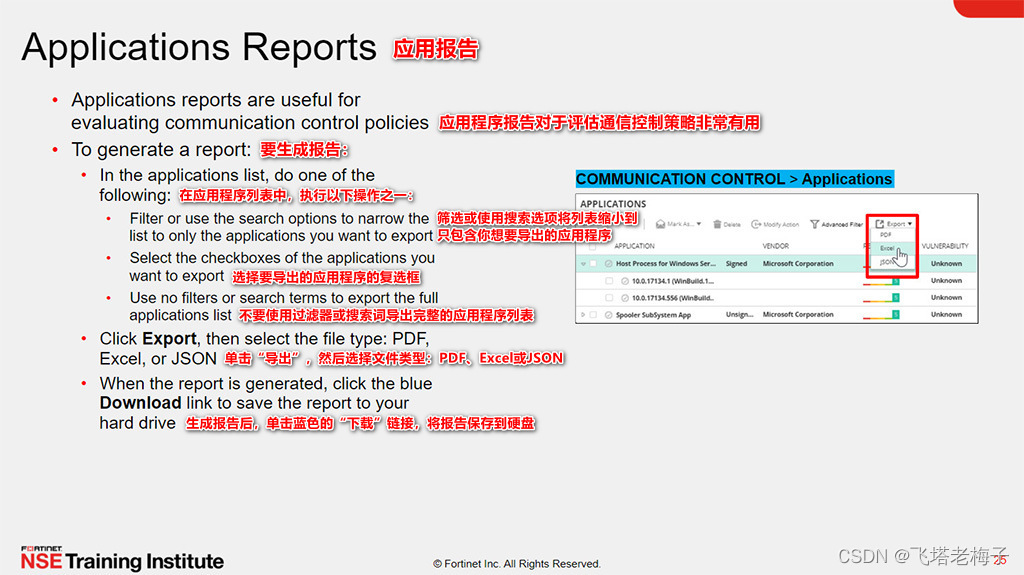 应用报告是评估通信控制策略的一个很好的工具。生成报告时,列表会反映所选视图中显示的应用程序。例如,如果你进行搜索,则报告只包括搜索的结果。如果你过滤列表,也会发生同样的事情;如果只显示未解析的应用程序,则报告只显示未解析的应用程序。你还可以手动选择特定项目的复选框,以导出一小组应用程序。如果需要完整的报告,请将筛选器设置为All,清除所有搜索结果,并清除所有应用程序的复选框。获得想要导出的列表后,单击应用程序列表顶部的export,然后选择格式。你可以导出为PDF、Excel或JSON。这时会打开一个弹出窗口,显示进度。准备好报告后,单击蓝色的下载链接并将其保存到硬盘驱动器。