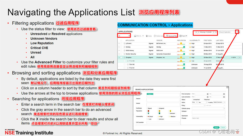 为什么使用通信控制?第一个关键优势是避免阻碍生产力的因素。被阻塞的应用程序仍然可以执行,只是不能通信。其次是无摩擦控制,这减少了用户审批应用程序的请求数量。三是可管理性。安全性或IT只需要处理与外部通信的应用程序。第四,FortiEDR提供声誉评分。每个应用程序的每个版本都被分配一个分数,从1(已知的坏)到5(已知的好)。这些分数允许你轻松地识别潜在危险的应用程序。第五,FortiEDR使用最新的CVE数据为每个应用程序版本分配漏洞评分。这意味着你可以精确定位暴露的区域。最后,你可以通过自动阻止不希望的应用程序进行通信来降低风险。你可以设置规则来阻止符合指定条件的任何应用程序的任何版本。例如,你可以阻止信誉评分为1的任何程序、漏洞评分较高或严重的任何版本,或者来自指定供应商的任何应用程序。