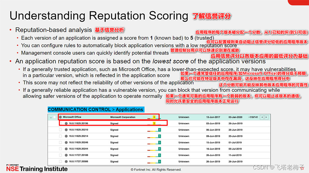 注意,每个应用程序版本都有自己的信誉评分。应用评分是基于其版本的最低信誉评分。所以,在这个例子中,你可以看到Microsoft Office的得分是3,这意味着它的可靠性有多种证据。Microsoft Office是一个知名的、值得信任的应用程序,你可以看到它是由Microsoft签名的,那么为什么它的分数会很低呢?看看这些版本。它们中的大多数被评为5级,但位于列表顶端的一个较老的版本被评为3级。最低的分数应用于应用程序,以便管理控制台用户收到任何潜在问题的警报。换句话说,得分较低的应用程序表明,你应该检查不安全的应用程序版本,但同一应用程序的其他版本可能是安全的。你可以拒绝来自某个特定版本的应用程序的通信。在这种情况下,你可以选择阻止可能存在问题的版本,但允许所有评级为5的其他版本。