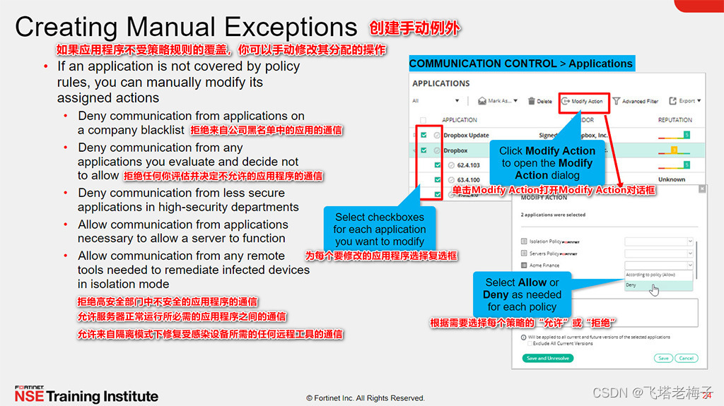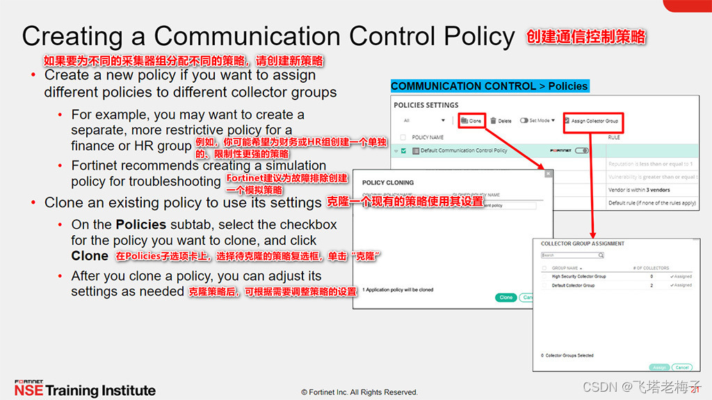 如何创建通信控制策略?如前所述,如果希望允许不同的用户组使用不同的应用程序,例如,如果希望对财务部门的限制大于对其他用户的限制,则需要创建其他策略。Fortinet还建议创建一个模拟策略来帮助你排除潜在的阻塞问题。