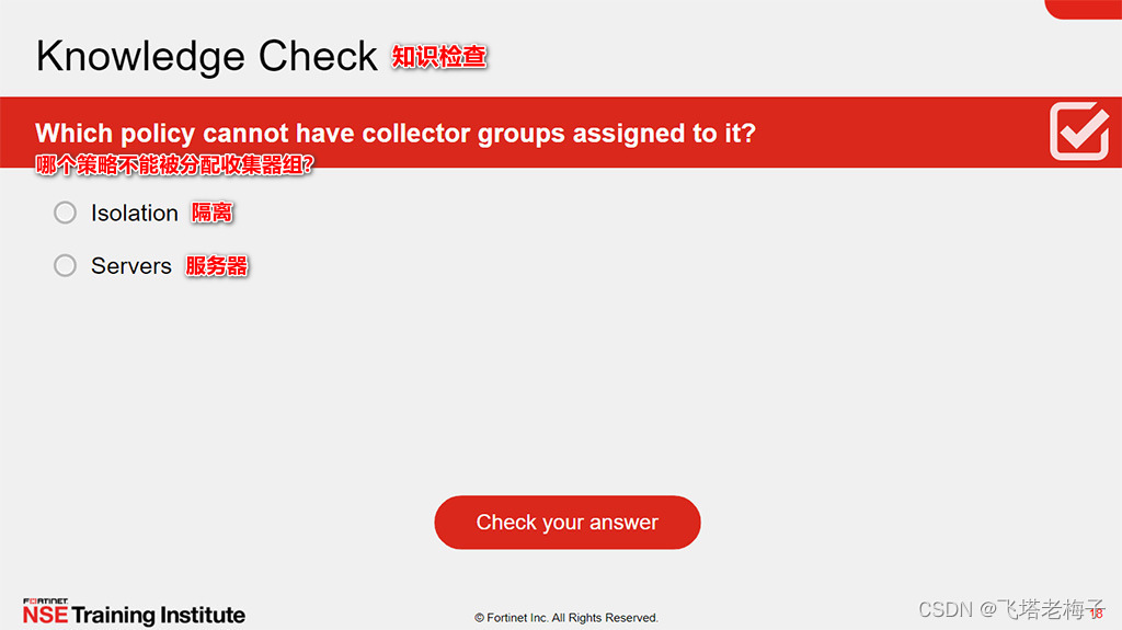 最后是隔离策略。隔离策略与其他策略不同,因为不能将收集器组分配给隔离策略。如果设备受到感染并进入隔离模式,则该收集器将自动分配给隔离策略,而不管它属于哪个组。隔离是另一种少见的策略,默认设置为Deny。隔离模式是一种临时状态,目的是在设备修复之前遏制任何感染。这意味着该设备不能连接到试图传播其感染的网络。你应该只允许需要调查和修复设备的应用程序。