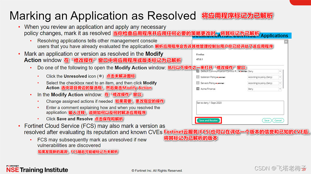 若要解析项,请打开“修改操作”窗口。你可以通过单击应用程序或版本旁边的灰色Unresolved图标来打开窗口,或者选中复选框并单击Modify Action。更改与项关联的操作后,单击Save并Resolve,可以简化工作流程。如果你不需要更改操作,则使用相同的过程,但不要进行任何更改。如果需要,你可以输入一个说明,然后单击保存和解决。请注意,如果将Applications筛选器设置为仅显示未解析事件,则在将应用程序标记为已解析后,该应用程序将不会显示在列表中。如果你需要再次找到它,你可以更改过滤器以显示所有。