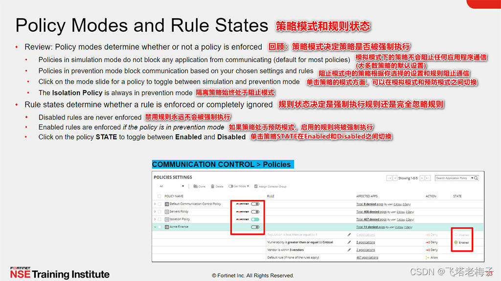 就像安全策略一样,通信控制策略可以处于模拟或预防模式。在模拟模式下,没有任何应用程序被阻止通信。在预防模式下,根据所选择的设置允许或拒绝通信。策略处于模拟模式。你可以在完成调优阶段时启用它们,这将在本课后面介绍。隔离策略是例外。正如你前面了解到的,这种策略与其他策略的工作方式不同。其中一个不同之处在于它的模式,它被永久地设置为预防模式。这是为了确保处于隔离模式的受感染设备始终受到保护和包含。