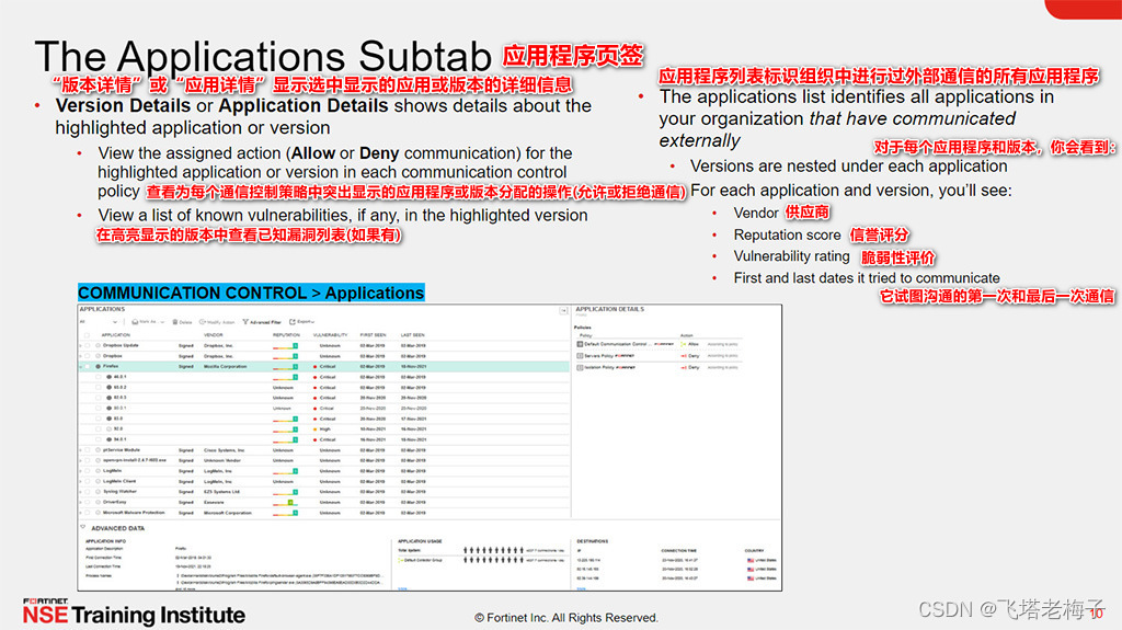 现在你将了解管理控制台中的COMMUNICATION CONTROL。首先对Applications子选项卡进行非常高级的概述。你可以通过单击COMMUNICATION CONTROL选项卡并选择Applications来访问此屏幕。你首先注意到的是应用程序列表。应用程序列表标识组织中进行过外部通信的所有应用程序。如果应用程序从未尝试建立连接,那么它不会显示在这里。单击一个应用程序可以查看该应用程序的所有版本,这些版本已经从你的环境通信。对于每个应用程序及其每个版本,你可以看到供应商、信誉评分、漏洞评级以及它试图通信的第一次和最后一次日期。