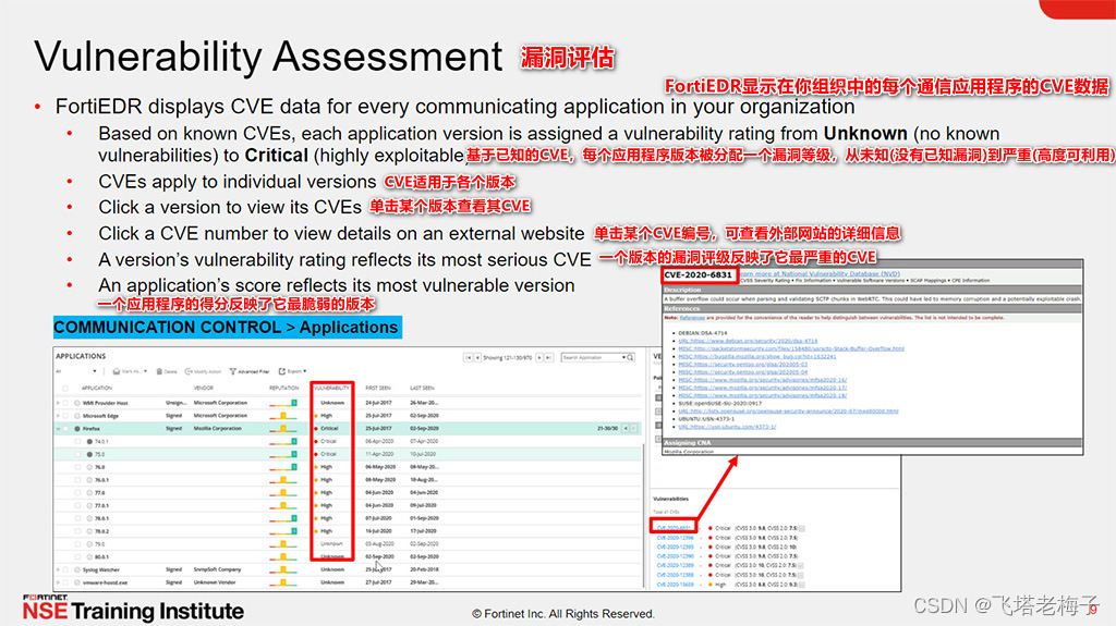 漏洞评分是评估环境中风险的另一个很好的工具。Fortinet使用最新的CVE数据为每个应用程序版本分配漏洞评分。漏洞评分范围从未知(没有已知漏洞)到严重(高度可利用漏洞)。与信誉评分一样,应用程序的漏洞评分反映了其最脆弱的版本。这就是为什么在本例中,Firefox被列为“严重”的原因,尽管这里显示的一些版本有很高的漏洞得分,而其他版本没有已知的漏洞。单击某个版本可以查看已知漏洞及其严重性的列表。在上图显示的示例中,选择了一个具有关键漏洞的版本。你可以通过检查版本详细信息窗格的顶部来查看选择了哪个版本。你可以看到有41个已知的CVE。记住,漏洞是特定于版本的,所以如果突出显示应用程序而不是特定的版本,则不会看到任何漏洞。单击某个CVE标识符,可以在外部网站上查看该CVE的所有详细信息。注意,在这种情况下,并非所有的漏洞都是关键的。FortiEDR根据一个版本的最容易被利用的漏洞来打分。这再次将你的注意力引向潜在的问题。具有至少一个关键CVE的版本被评为关键,具有至少一个关键版本的应用程序被评为关键。提醒你,只有当你拥有“预测和保护”或“预测、保护和响应”许可证时,你才能看到漏洞数据。
