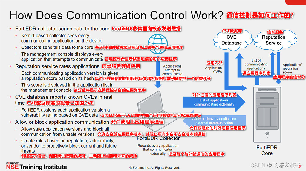 通信控制是如何工作的?它从FortiEDR收集器开始。收集器安装在内核级别,因此它可以看到设备上发生的一切。收集器正在监视的事情之一是哪些应用程序正在用户的终端设备上通信。它将数据发送到核心,进行评估。核心将文件散列发送给信誉服务,该服务返回一个信誉评分。核心还会查询CVE数据库,并接收每个应用程序版本的CVE列表。这个列表会不断更新,所以一旦发现新的漏洞,你就会得到通知。所有检测到的应用程序和版本都显示在管理控制台中,以及它们的信誉和漏洞分数,因此你可以很容易地发现有潜在问题的应用程序。每个应用程序和版本都可以根据手动设置或配置的规则进行通信或拒绝通信。核心将这些信息发送回收集器,收集器根据从核心接收到的判断来管理设备的连接。