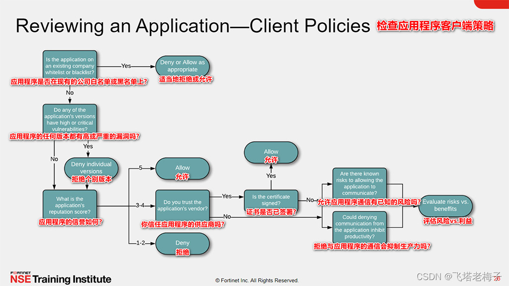 现在仔细看看一般客户政策的决策过程。这些是应用于大多数用户的策略,默认操作是允许的。对于每个应用程序,在决定是否允许或拒绝该应用程序时询问以下问题。首先,应用程序是在现有的黑名单还是白名单上?如果是的话,你可以用这个列表来做决定。