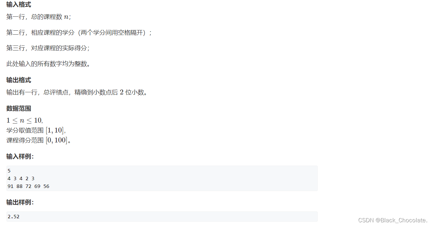 int n;inline double Done(int x){if(x >= 90 && x <= 100) return 4.0;else if(x>=85 && x <=89) return 3.7;else if(x>=82 && x <=84) return 3.3;else if(x>=78 && x <=81) return 3.0;else if(x>=75 && x <=77) return 2.7;else if(x>=72 && x <=74) return 2.3;else if(x>=68 && x <=71) return 2.0;else if(x>=64 && x <=67) return 1.5;else if(x>=60 && x <=63) return 1.0;else return 0;