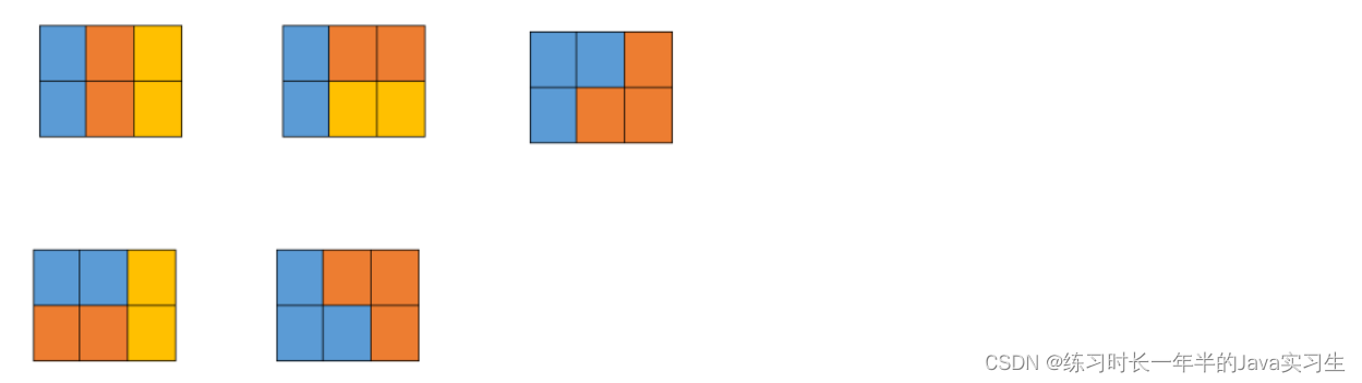 对于 30% 的数据,N≤10, 输入样例: 输出样例: 思路:注意灌木是先长高 1 厘米然后被剪到 0 厘米, 每棵树的最大高度取决于该数第一次被剪,到下一次被剪中间间隔多少天。 如果往左走:从 i 走到 n ,一共有 ( n - i ) 天,再从 n 走到 i ,一共有 ( n - i ) 天,则最高为:2 * ( n - i ) 天. 如果从右往左走:最高为:2 * ( i - 1 ) 天 . 则最大值为 max ( 2 * ( n - i ) , 2 * ( i - 1 ) ) . 进制规定了数字在数位上逢几进一。 X 进制是一种很神奇的进制,因为其每一数位的进制并不固定! 例如说某种 X 进制数,最低数位为二进制,第二数位为十进制,第三数位为八进制,则 X 进制数 321 转换为十进制数为 65。 现在有两个 X 进制表示的整数 A 和 B,但是其具体每一数位的进制还不确定,只知道 A 和 B 是同一进制规则,且每一数位最高为 N 进制,最低为二进制。 请你算出 A−B 的结果最小可能是多少。 请注意,你需要保证 A 和 B 在 X 进制下都是合法的,即每一数位上的数字要小于其进制。 输入格式 第一行一个正整数 N,含义如题面所述。 第二行一个正整数 Ma,表示 X 进制数 A 的位数。 第三行 Ma 个用空格分开的整数,表示 X 进制数 A 按从高位到低位顺序各个数位上的数字在十进制下的表示。 第四行一个正整数 Mb,表示 X 进制数 B 的位数。 第五行 Mb 个用空格分开的整数,表示 X 进制数 B 按从高位到低位顺序各个数位上的数字在十进制下的表示。 请注意,输入中的所有数字都是十进制的。 输出格式 输出一行一个整数,表示 X 进制数 A−B 的结果的最小可能值转换为十进制后再模 1000000007 的结果。 数据范围 对于 30% 的数据,N≤10; Ma,Mb≤8, 输入样例: 输出样例: 样例解释 当进制为:最低位 2 进制,第二数位 5 进制,第三数位 11 进制时,减法得到的差最小。 此时 A 在十进制下是 108,B 在十进制下是 14,差值是 94。 思路: 先看看321->65,65=3*10*2+2*2+1 要使A-B最小,只要使数字的各位进制最小即可,就是对A和B的相同数位取 maxv=max(a[i],b[i]),然后因为最小进制为2,所以每一位的最小进制为max(maxv+1,2). 存储A和B的值,只需要开一个数组存储各位数字的权重,然后将各位数字和对应权重相乘后再相加即可。 给定一个 N×M 的矩阵 A,请你统计有多少个子矩阵 (最小 1×1,最大 N×M) 满足子矩阵中所有数的和不超过给定的整数 K? 输入格式 第一行包含三个整数 N,M 和 K。 之后 N 行每行包含 M 个整数,代表矩阵A。 输出格式 一个整数代表答案。 数据范围 对于 30% 的数据,N,M≤20 输入样例: 输出样例: 样例解释 满足条件的子矩阵一共有 19,包含: 思路:二维前缀和+双指针 直接暴力枚举的话,复杂度将是O(N^4),会超时 使用双指针优化: 使用4个指针枚举子矩阵的四个方向,如果子矩阵的和大于k,则后面的指针前进,直到子矩阵的和不大于k 小明最近迷上了积木画,有这么两种类型的积木,分别为 I 型(大小为 2 个单位面积)和 L 型(大小为 3 个单位面积): 同时,小明有一块面积大小为 2×N2×N 的画布,画布由 2×N2×N 个 1×11×1 区域构成。 小明需要用以上两种积木将画布拼满,他想知道总共有多少种不同的方式? 积木可以任意旋转,且画布的方向固定。 输入格式 输入一个整数 NN,表示画布大小。 输出格式 输出一个整数表示答案。 由于答案可能很大,所以输出其对 10000000071000000007 取模后的值。 数据范围 1≤N≤1071≤N≤107。 输入样例: 输出样例: 样例解释 五种情况如下图所示,颜色只是为了标识不同的积木: 思路:状态压缩dp f(i,j)表示已经操作完前i-1列,且第i列的状态为j的所有方案的集合 小明最近迷上了一款名为《扫雷》的游戏。 其中有一个关卡的任务如下: 在一个二维平面上放置着 n 个炸雷,第 i 个炸雷 (xi,yi,ri) 表示在坐标 (xi,yi) 处存在一个炸雷,它的爆炸范围是以半径为 ri 的一个圆。 为了顺利通过这片土地,需要玩家进行排雷。 玩家可以发射 m 个排雷火箭,小明已经规划好了每个排雷火箭的发射方向,第 j 个排雷火箭 (xj,yj,rj) 表示这个排雷火箭将会在 (xj,yj) 处爆炸,它的爆炸范围是以半径为 rj 的一个圆,在其爆炸范围内的炸雷会被引爆。 同时,当炸雷被引爆时,在其爆炸范围内的炸雷也会被引爆。 现在小明想知道他这次共引爆了几颗炸雷? 你可以把炸雷和排雷火箭都视为平面上的一个点。 一个点处可以存在多个炸雷和排雷火箭。 当炸雷位于爆炸范围的边界上时也会被引爆。 输入格式 输入的第一行包含两个整数 n、m。 接下来的 n 行,每行三个整数 xi,yi,ri 表示一个炸雷的信息。 再接下来的 m 行,每行三个整数 xj,yj,rj 表示一个排雷火箭的信息。 输出格式 输出一个整数表示答案。 数据范围 对于 40% 的评测用例:0≤x,y≤109,0≤n,m≤103,1≤r≤10, 输入样例: 输出样例: 样例解释 示例图如下,排雷火箭 1 覆盖了炸雷 1,所以炸雷 1 被排除;炸雷 1 又覆盖了炸雷 2,所以炸雷 2 也被排除。 思路:哈希表 图的遍历 建图,把每个雷看成是图中的一个点,暴搜每一个点,使用st表保证每个点只被搜索到一次。 话说大诗人李白,一生好饮。 幸好他从不开车。 一天,他提着酒壶,从家里出来,酒壶中有酒 2 斗。 他边走边唱: 无事街上走,提壶去打酒。 逢店加一倍,遇花喝一斗。 这一路上,他一共遇到店 N 次,遇到花 M 次。 已知最后一次遇到的是花,他正好把酒喝光了。 请你计算李白这一路遇到店和花的顺序,有多少种不同的可能? 注意:壶里没酒 (0 斗) 时遇店是合法的,加倍后还