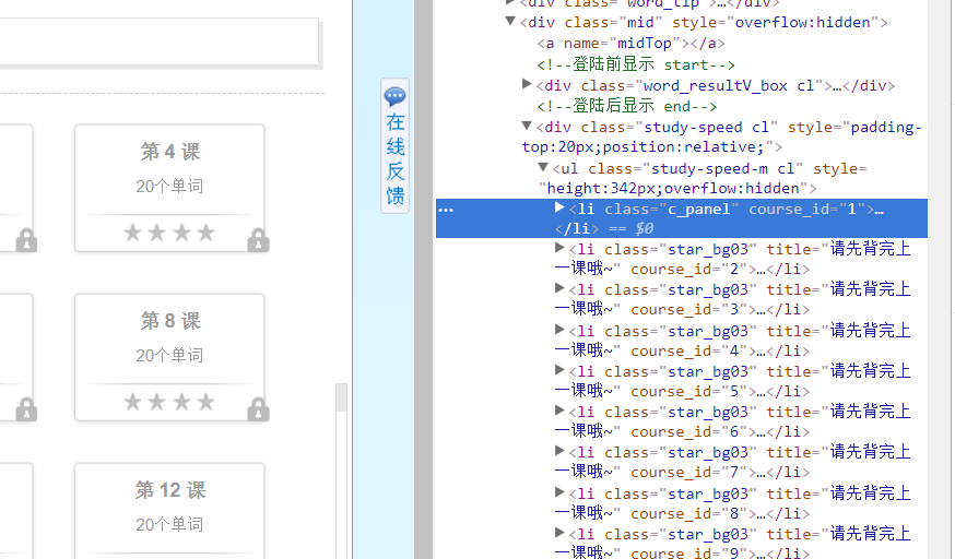 5.获取course(课时内容,一门课程有多节课时)界面HTML,在course中得到word(单词)、pronunciation(发音)、translation(翻译)