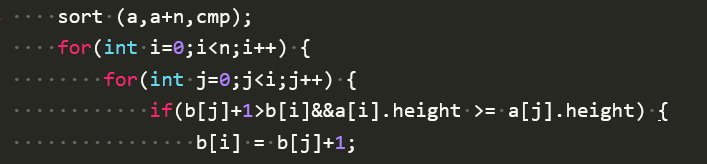 题目要求,录入N个人员信息,根据他们的身高体重,得到一个满足下层人员身高、体重>=上层员工的最大子序列长度。首先我们按照体重,对所有的员工进行升序排序,当体重相同时,按照身高降序排序。再声明一个记录高度的数组,长度为N,对应n个员工在罗汉塔的位置。对排序后的员工进行遍历,当a[i].height >= a[j].height时,更新对应员工的所在高度。每次遍历完更新最大的高度数。遍历完成,输出的结果即为罗汉塔的最大高度。