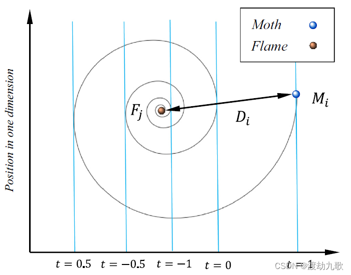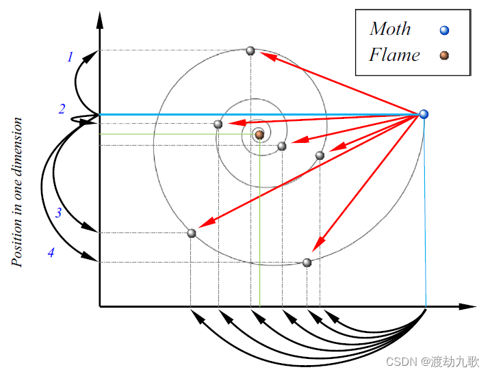 下图为飞蛾围绕火焰位置更新的概念模型。注意,纵轴只显示一维(给定问题的1个变量/参数),但是所提出的方法可以用来改变问题的所有变量。