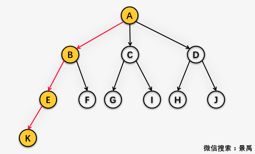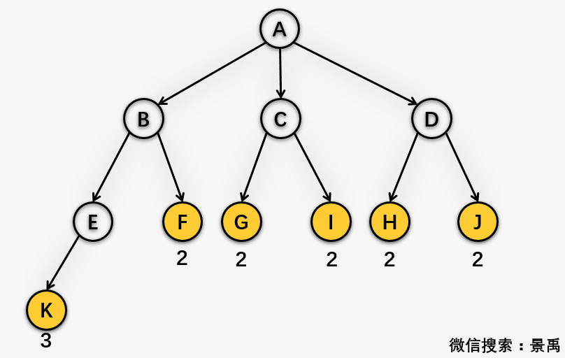 结点K的路径长度就是从根结点A到结点K的路径上的连接数,也就是我们看到红色连边,当然就是3喽!