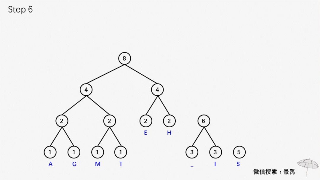有了霍夫曼编码树的特性,我们也知道了霍夫曼树的构造过程,最后再给大家看一个霍夫曼编码及霍夫曼树构造的完整示例。