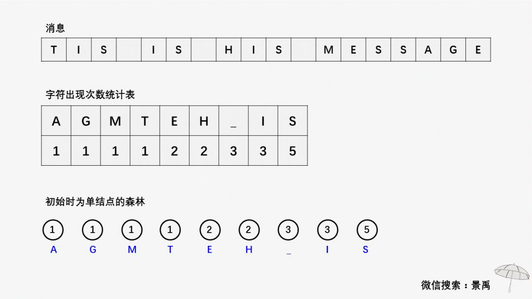 示例:建立消息 This is his message 的一颗赫夫曼编码树。
