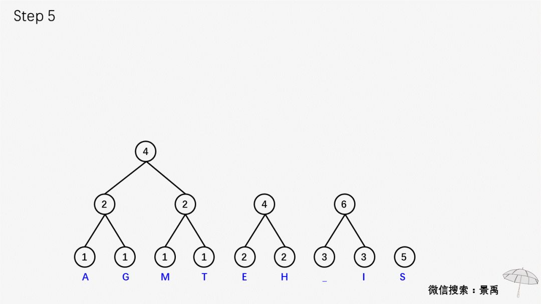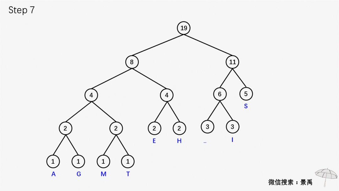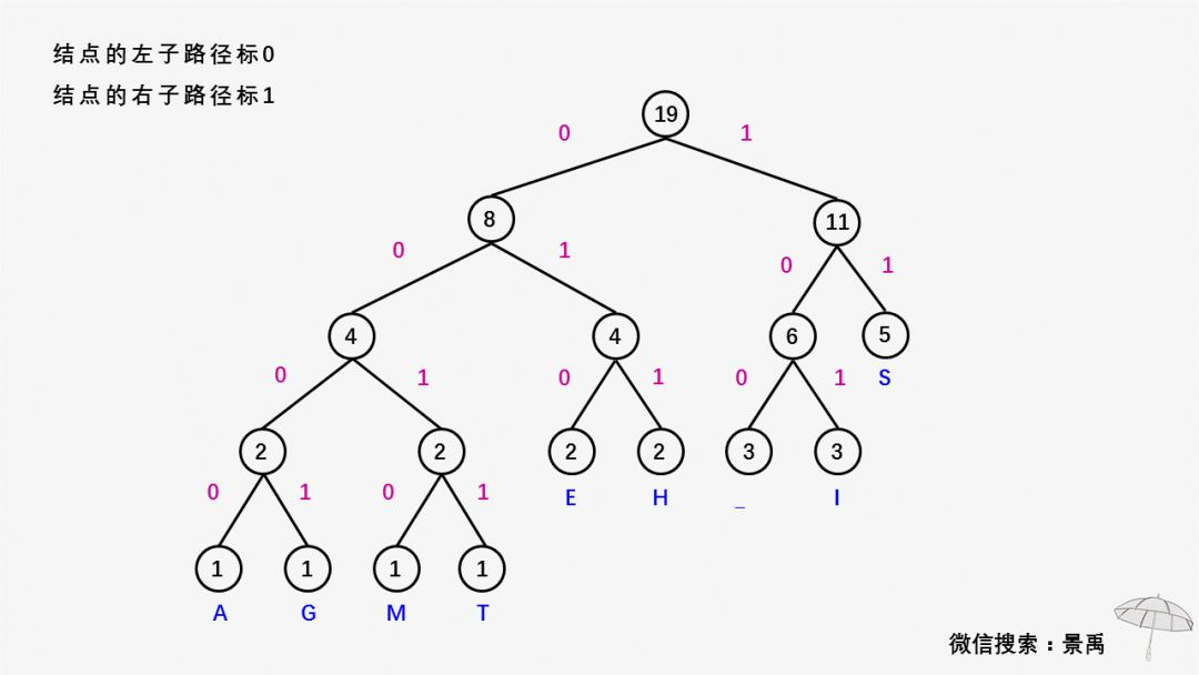 } 得到赫夫曼树之后,我们就可以得到字符的赫夫曼编码了。