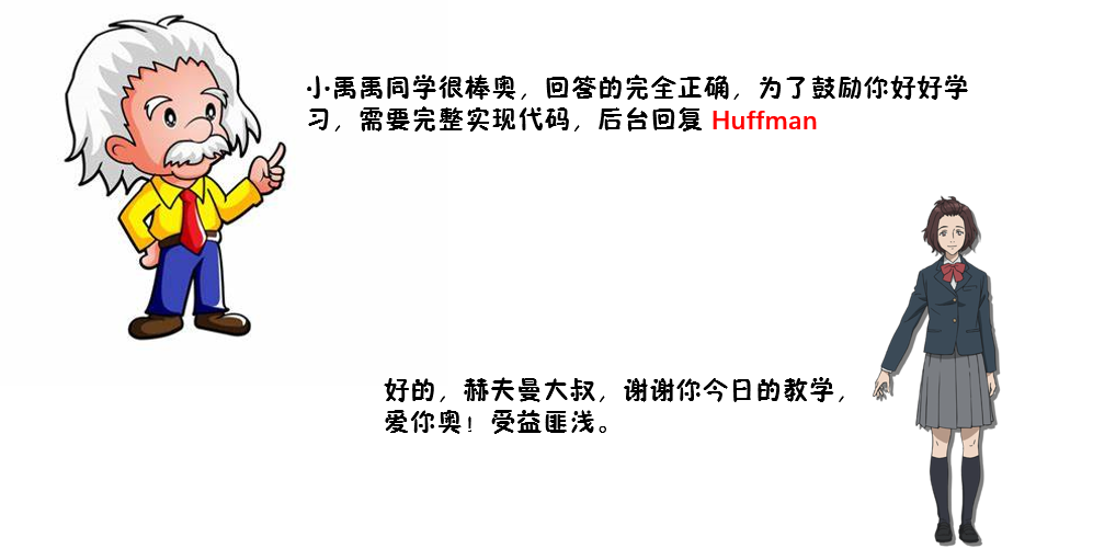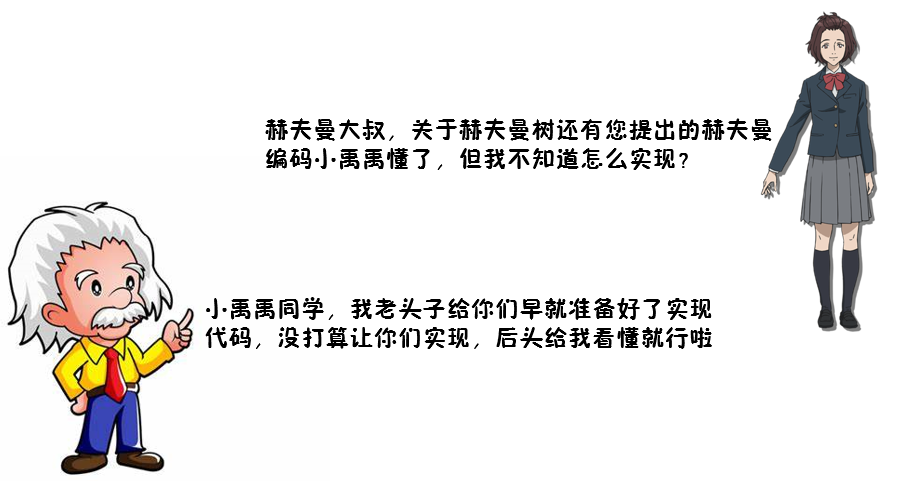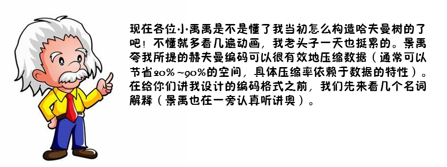 为了给大家讲清楚赫夫曼树,今天景禹请来了我们麻省理工学院的赫夫曼大叔,景禹先拍一拍赫夫曼大叔的马屁。