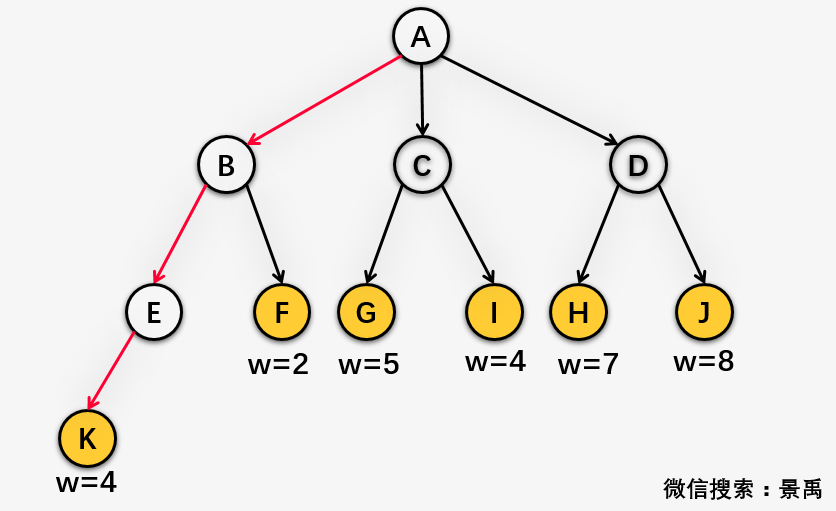 结点K的路径长度为3,权重w=4,所以结点K的带权路径长度为3 * 4 = 12