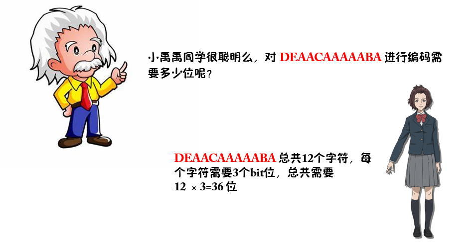 赫夫曼大叔解答:使用22位对消息DEAACAAAAABA进行编码的前缀码编码方案很多。消息中字符 A 出现了8次,字符 B、C、D 和 E 均只出现了1次;字符 A 用一个bit位表示,A=0,其他字符的编码均不能以0开头;B=10、C=110、D=1110和 E=11110;DEAACAAAAABA=1110111100011000000100,刚好22位。老头子再给你们提供其他几种,自己下去尝试尝试。