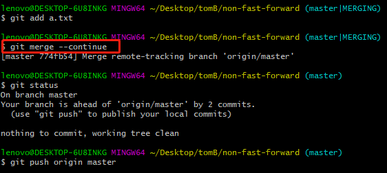 对于上面出现的non-fast-forward错误,我们有两种解决办法。一种是rebase,一种是merge操作。下面我们以第二种方式来解决这个问题。