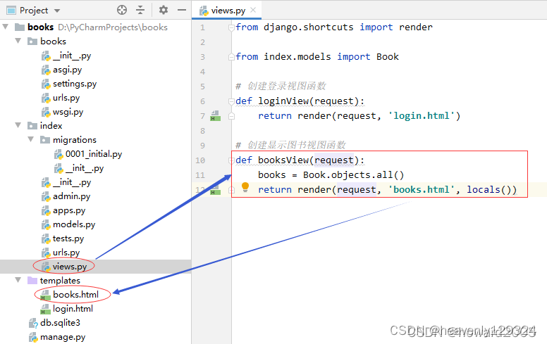 - 在index的views.py里创建booksView视图函数