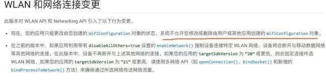 注意:我翻译下,官方的意思是说由用户手动创建和其他app创建的WifiConfiguration配置信息是不能被我们修改的。明白了吗?和切换没有什么关系。因为我们不修改,只是连接切换操作。