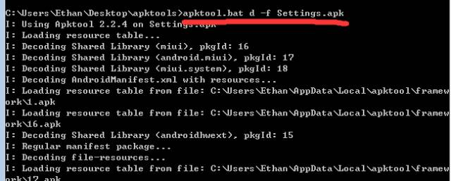 使用 ApkTools输入命令:apktool.bat d -f Settings.apk (注意Settings.apk的路径,我这里是拷贝到了apktool 同一个目录下)