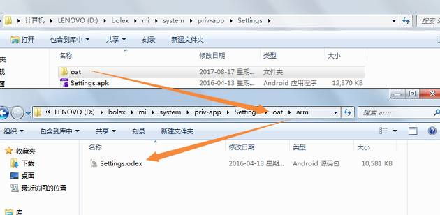 老司机可能一眼就看到了这个目录非同寻常,没错,正是MIUI的rom解压缩后的目录。其中\system\priv-app\Settings是系统设置应用的路径。我们发现其中有一个oat\arm目录打开后可以发现里面有一个Settings.odex文件。而这个文件正是Settings.app的源码文件。