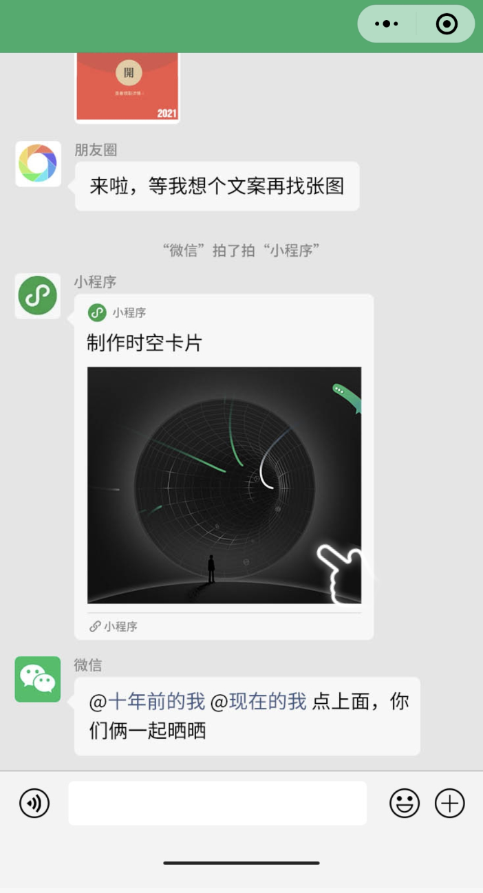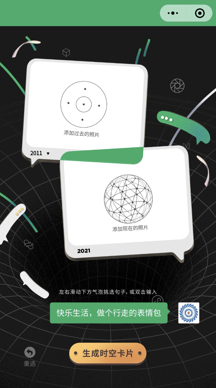 打开小程序后先不用操作,也不用担心以为中毒了乱刷屏😅,等其加载滚动完并听到音乐声会看到“制作时空卡片”: