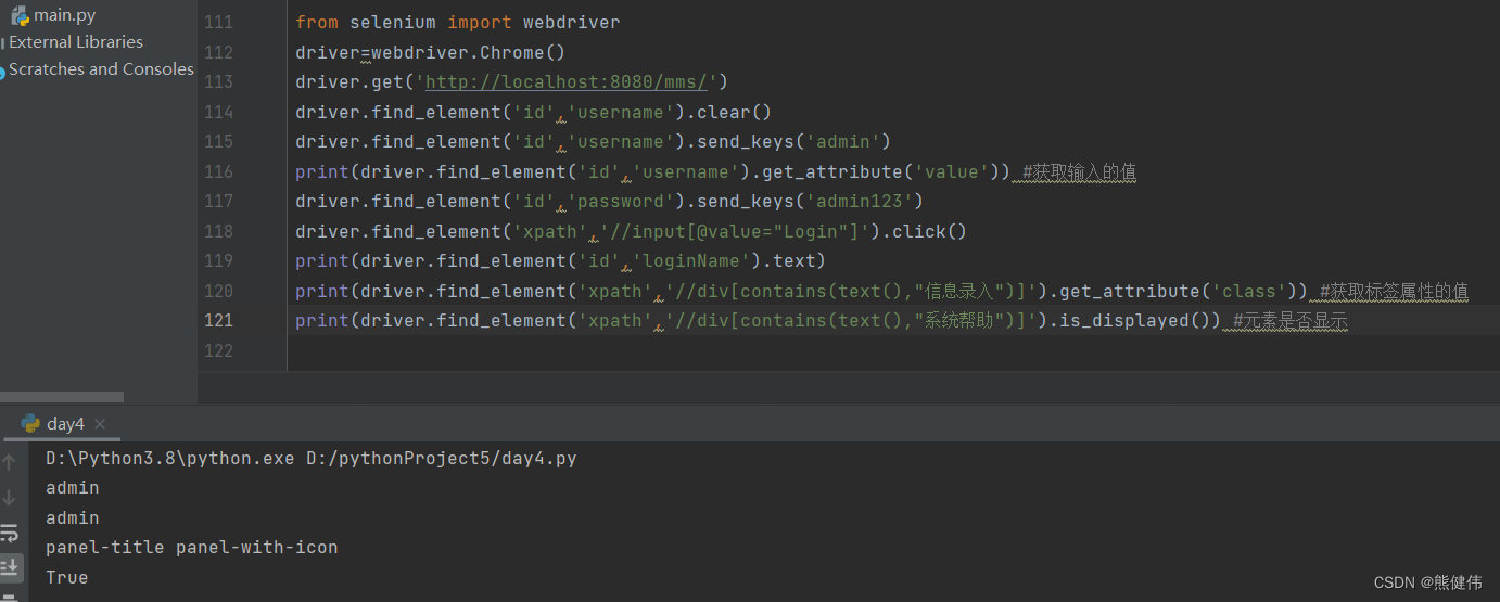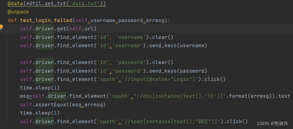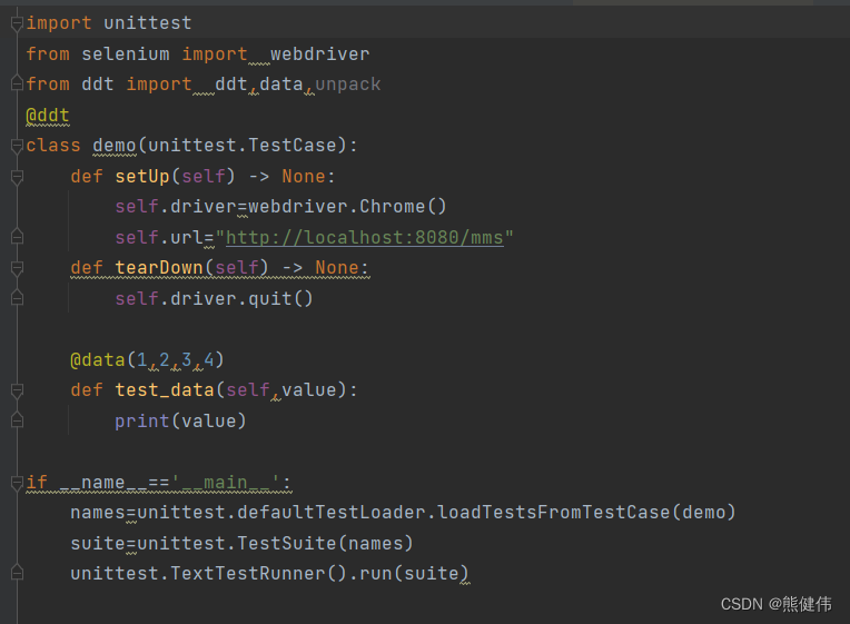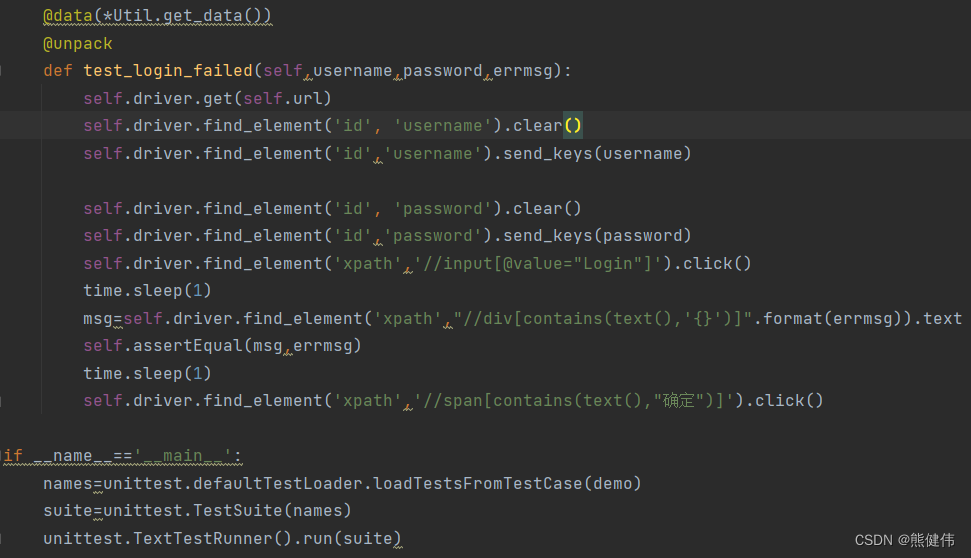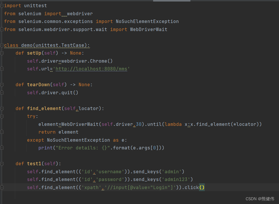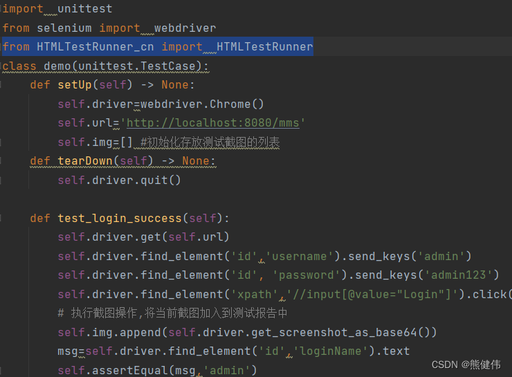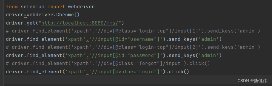 class demo(unittest.TestCase):def setUp(self) -> None:self.driver=webdriver.Chrome()self.url='http://localhost:8080/mms'def tearDown(self) -> None:self.driver.quit()def test_login_success(self):self.driver.get(self.url)self.driver.find_element('id','username').send_keys('admin')self.driver.find_element('id', 'password').send_keys('admin123')self.driver.find_element('xpath','//input[@value="Login"]').click()msg=self.driver.find_element('id','loginName').textself.assertEqual(msg,'admin')def test_login_failed_without_username(self):self.driver.get(self.url)self.driver.find_element('id','password').send_keys('admin123')self.driver.find_element('xpath','//input[@value="Login"]').click()msg=self.driver.find_element('xpath','//div[contains(text(),"不能为空")]').textself.assertEqual(msg,'User Id不能为空')if __name__=='__main__':unittest.main()