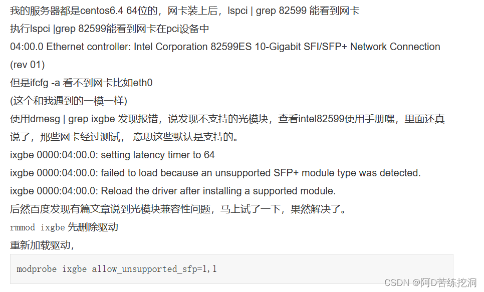 如果安装驱动很成功,但是网卡还是无法工作(就比如我,成功安装驱动后光网卡的信号灯还是不亮),这时候可能就需要重新去考虑硬件层的问题了,比如换个插槽,换根光纤,或者换个光模块(没错那个光模块坏了的倒霉鬼就是我)