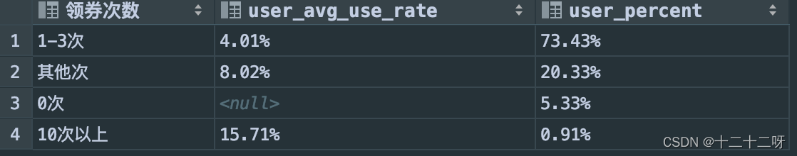 from(selectUser_id,casewhen user_rate = 0 then '核销率:0'when user_rate > 0 and user_rate < 0.3 then '核销率:0-30%'when user_rate >= 0.3 and user_rate< 0.5 then '核销率:30%-50%'when user_rate >= 0.5 then '核销率:50%以上'end as tagfrom temp)aa
