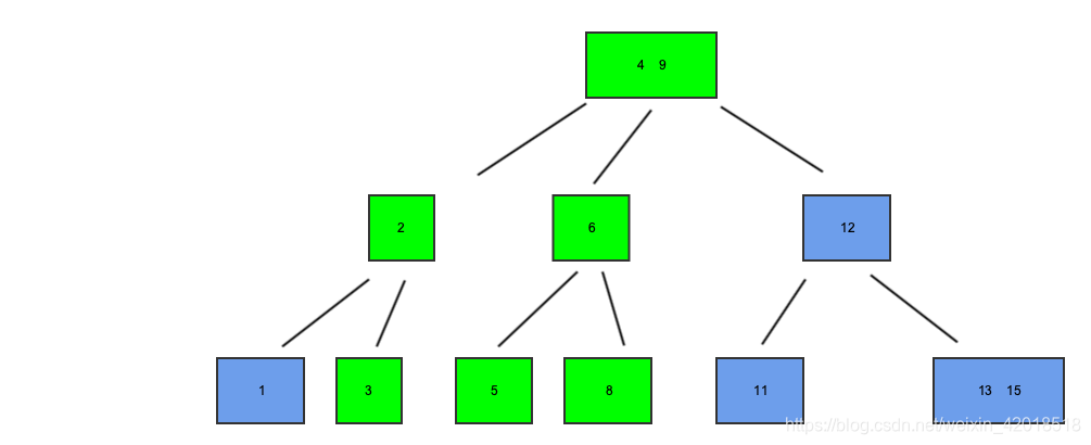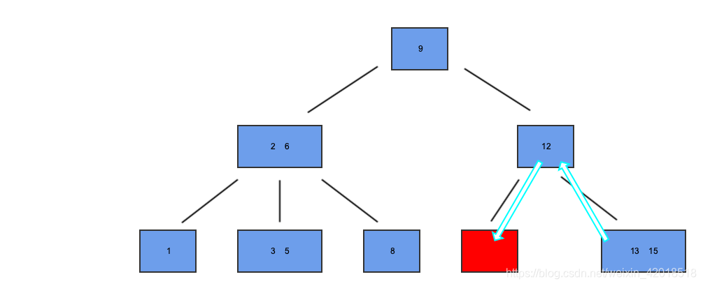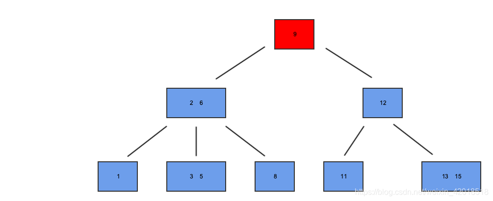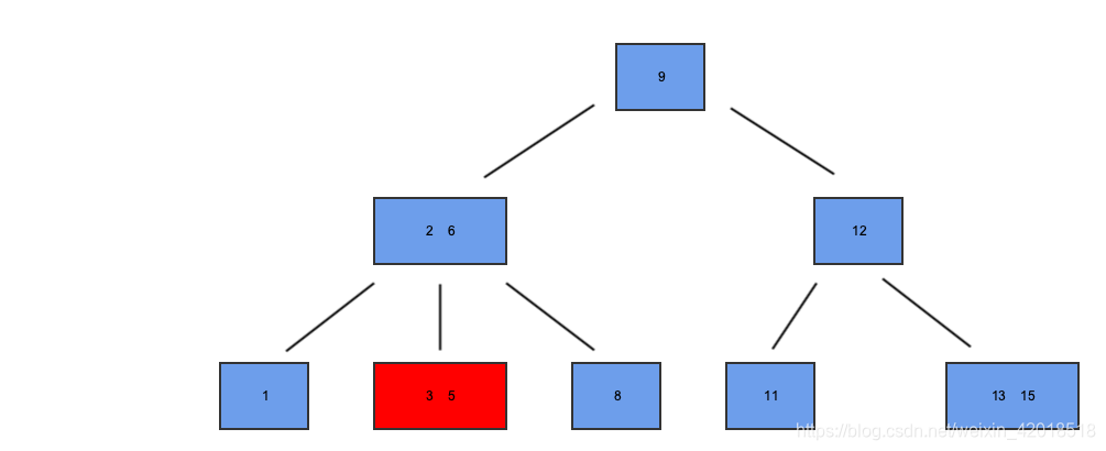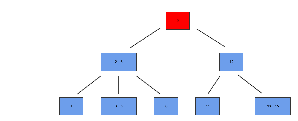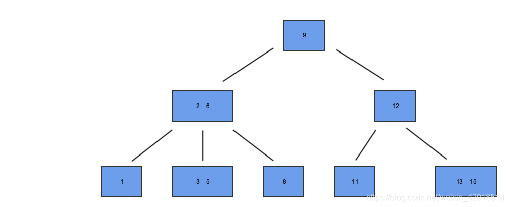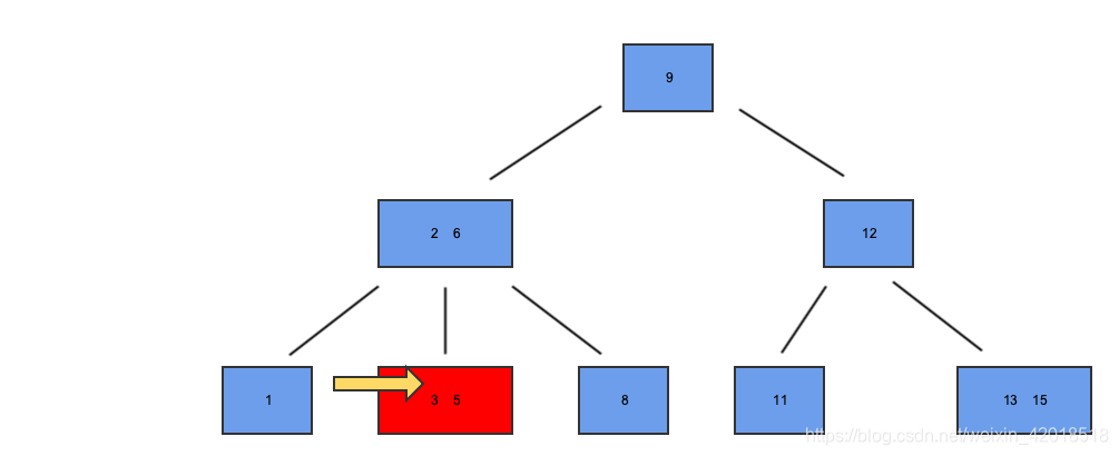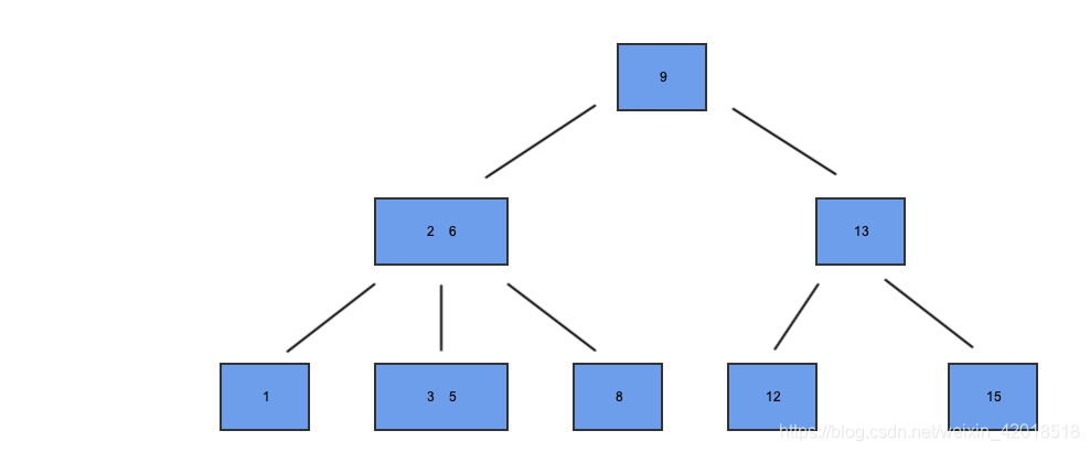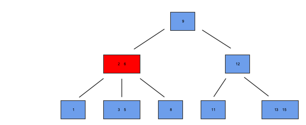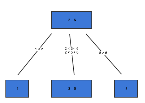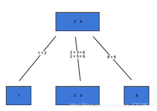 这棵树中,咋们重点来看(2,6)节点。该节点有两个元素 2 和 6,又有三个孩子 1,(3,5),8.其中 1 小于元素 2,(3,5)在元素 2,6 之间,8 大于(2,6),正好符合刚才所列的几条特征。