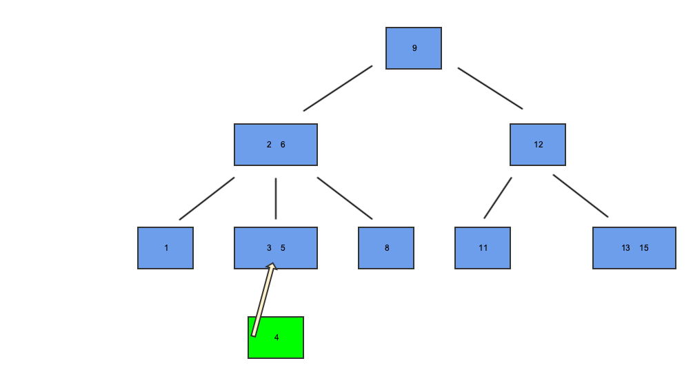自顶向下查找 4 的节点位置,发现 4 应当插入到节点元素 3,5 之间。