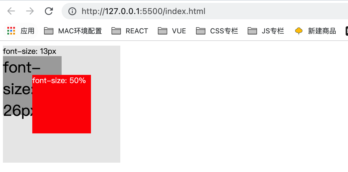 <html lang="en"><head><meta charset="utf-8"><title>css百分比</title><link rel="stylesheet" href="css/swiper.min.css"><link rel="stylesheet" href="css/certify.css"><script src="js/swiper.min.js"></script></head><body><div class="grandparent">font-size: 13px<div class="parent">font-size: 26px<div class="child">font-size: 50%</div></div></div>