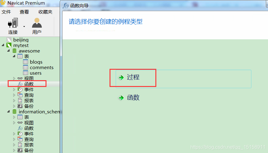 1.选择需要操作的数据库实例mytest,选中函数,右键-新建函数,选择过程,点击完成即可。(注意不是新建查询,而是新建函数)