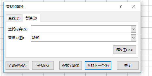 在考勤表的空白处输入缺勤(如下图所示),不可能使用Ctrl c Ctrl v 复制 首先选中该区域 Ctrl+F调出 选择 替换 查找内容留空,替换内容填缺勤,点击全部替换即可
