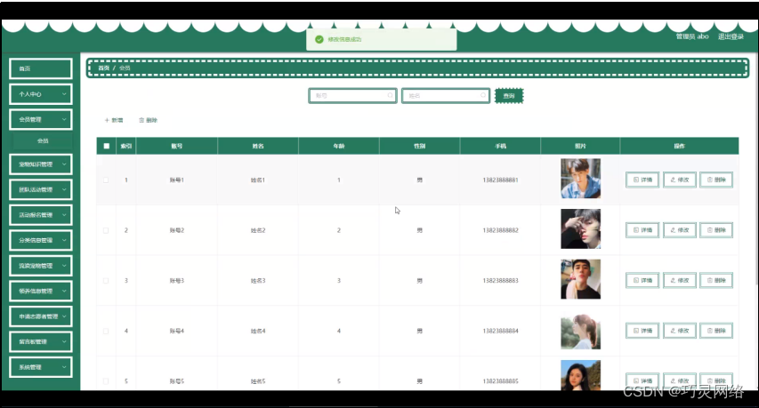 会员管理,在会员管理页面可以对索引,账号,姓名,年龄,性别,手机,照片等内容进行详情,修改和删除等操作,如图5-7所示。